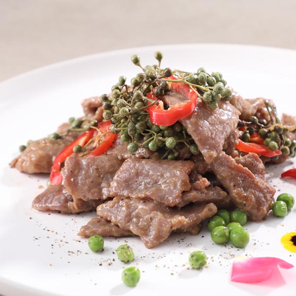 3、炒鍋放油,蔥、姜、蒜爆至有香味,再放入尚品牛肉,烹料酒,用芡汁勾芡,淋香油迅速盛出即可裝盤食用;